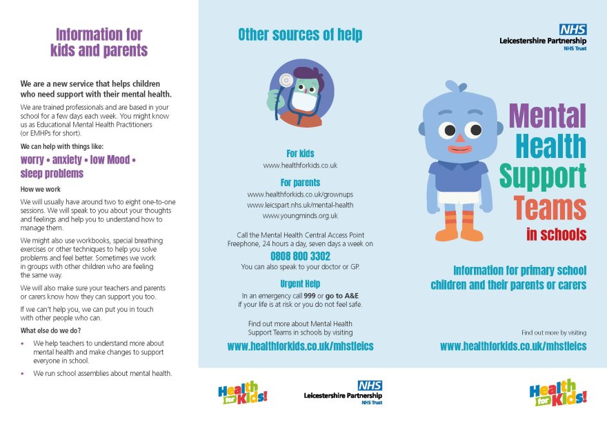 We are now working in partnership with the NHS Mental HealthSupport Team. They will take referrals from school for additional support - please take a look at the leaflet below detailing their service.